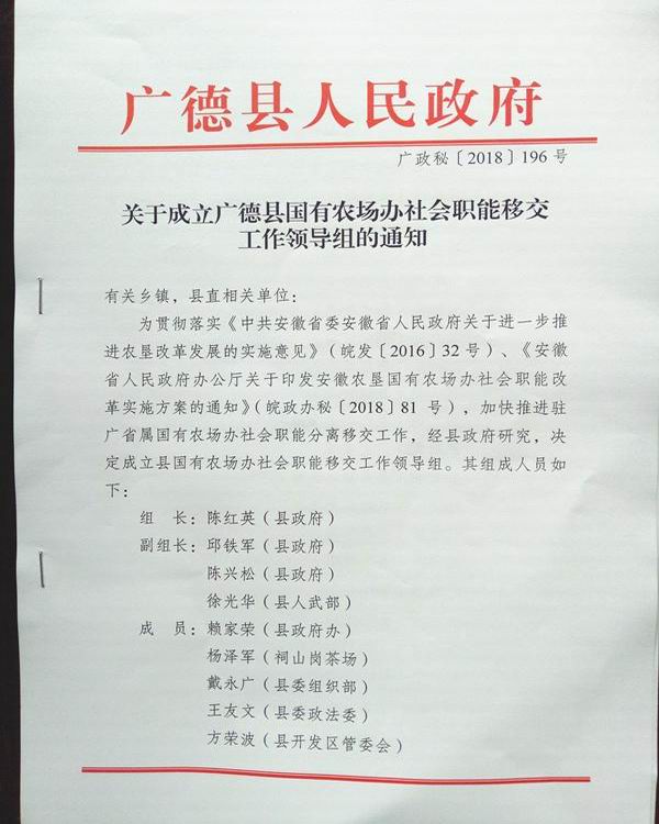 根据农垦集团部署要求,在皖垦茶业集团积极推动下,祠山岗茶场近日成立社会职能改革领导小组,就办社会职能移交工作与广德县政府及有关职能部门进行主动对接,经场县多轮协商,广德县政府制定了《推进驻广国有农垦企业办社会职能分离移交工作方案》(草案),并专门成立领导组,加快推进驻广省属农场办社会职能移交工作。