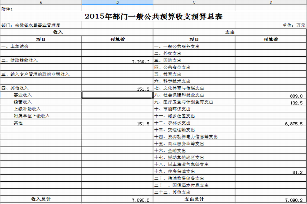 按照综合预算管理的原则,安徽省农垦事业管理局所有收入和支出均纳入部门预算管理。安徽省农垦事业管理局2015年收支总预算7898.2万元,收入包括:财政拨款收入、其他收入,支出包括:农林水支出、社会保障和就业支出、医疗卫生支出、住房保障支出。