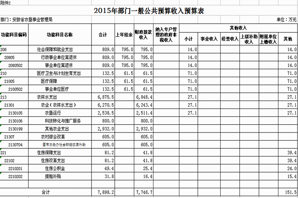 安徽省农垦事业管理局2015年收入预算7898.2万元,其中:财政拨款收入7746.7万元,占98.1%;其他收入151.5万元,占1.9%。