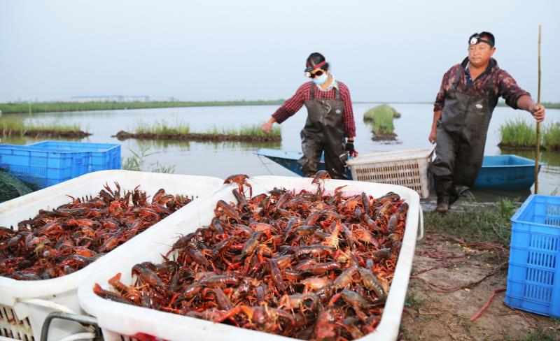 “今天捕捞的小龙虾有3000来斤,能卖3万多块钱。”5月31日,刚从虾田上岸的安徽农垦华阳河农场第九农业分公司职工陈多四,从船上搬下一筐筐活蹦乱跳的小龙虾说。等侯在田头多时的苏州客商以每斤10元的价格收购,经过清洗、分拣、装箱打包后,要在第二天凌晨2点前运到苏州南环桥农副产品批发市场,赶苏州的早市交易。
