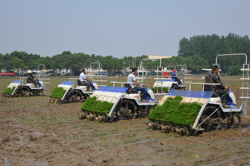 6月14日,安徽农林水工会和安徽农垦集团工会联合在大圹圩农场举办了水稻机插秧技能比武大赛,来自安徽农垦系统的10名机插秧能手参赛。(安徽日报2015年6月15日02版,通讯员李炳旺 夏庆芳摄)