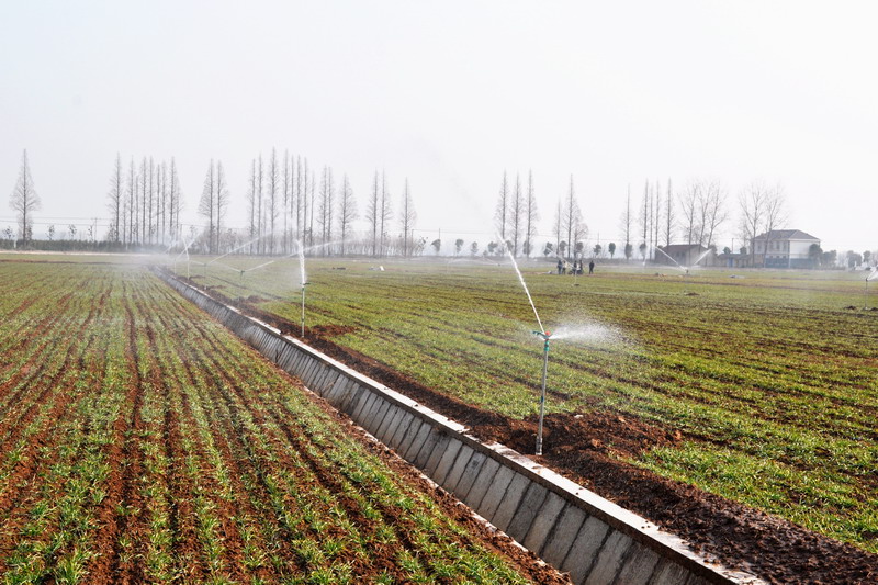 1月9日,安徽农垦潘村湖农场小麦良种繁育田的自动喷灌系统正在进行浇水作业。针对近期持续少雨天气,农场按照小麦高产栽培技术规程要求,及时对出现旱情的田块进行节水灌溉,确保3万余亩在地小麦苗齐苗壮、安全越冬。(安徽日报2015年1月10日02版,杨登宏摄)