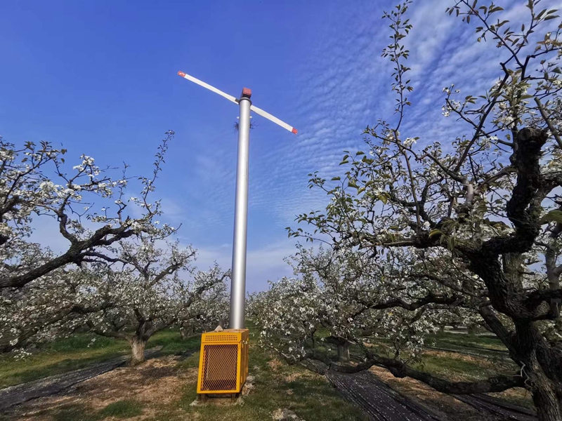 砀山果园场公司产业科技部主任、农业技术推广研究员陈加红告诉记者,过去,一到3月底4月初梨树开花季节,梨农就害怕,怕倒春寒冻坏梨花,可能会绝收。他指着一台像风力发电机一样的“大家伙”说,这叫防霜风机,梨树开花季节,如果出现低温霜冻天气,打开机器,就可以提高果园温度2-3摄氏度。