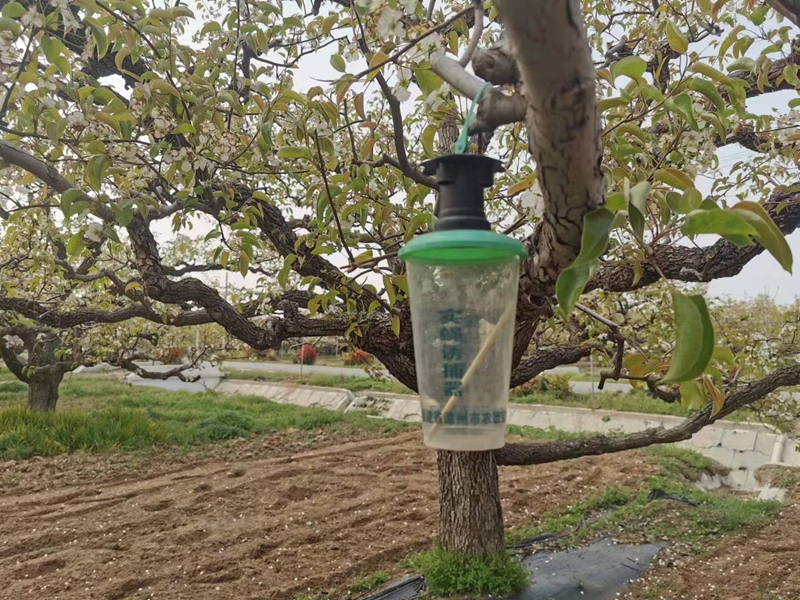 记者正在梨园里穿行,砀山果园场公司工会主席王建岭指着挂在树上的绿瓶和一节白色管子问:“记者同志,你知道这些是干什么的吗?”记者一脸茫然,王建岭笑着揭开谜底:“绿色的是果实蝇诱捕器,白色的是太阳能杀虫灯,这些绿色防控系统可以减少农药使用量,确保梨的优质和绿色。”