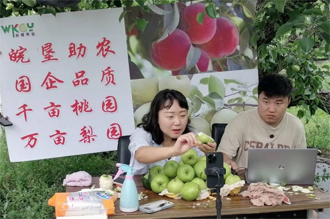 近几日,砀山果园场公司携手直播团队在统一经营梨园架起直播间,开展直播促进水果销售。