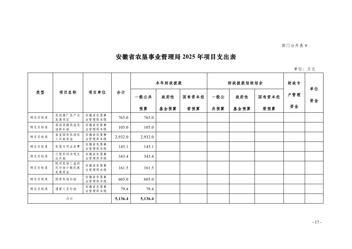 安徽农垦集团:安徽省农垦事业管理局2025年度项目支出绩效目标