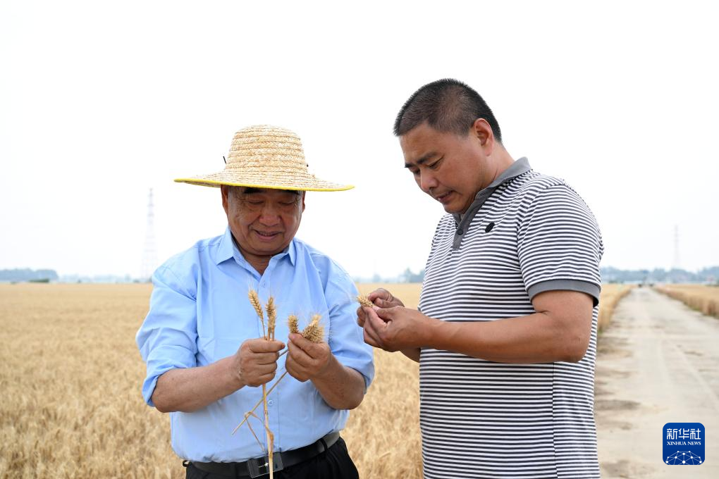 5月28日,徐淙祥(左)在阜阳市太和县旧县镇的田间和种粮大户交流小麦的成熟情况。