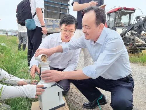测产现场,农业专家正细致地将稻粒倒入检测设备,严格开展水分、品质等指标测定。