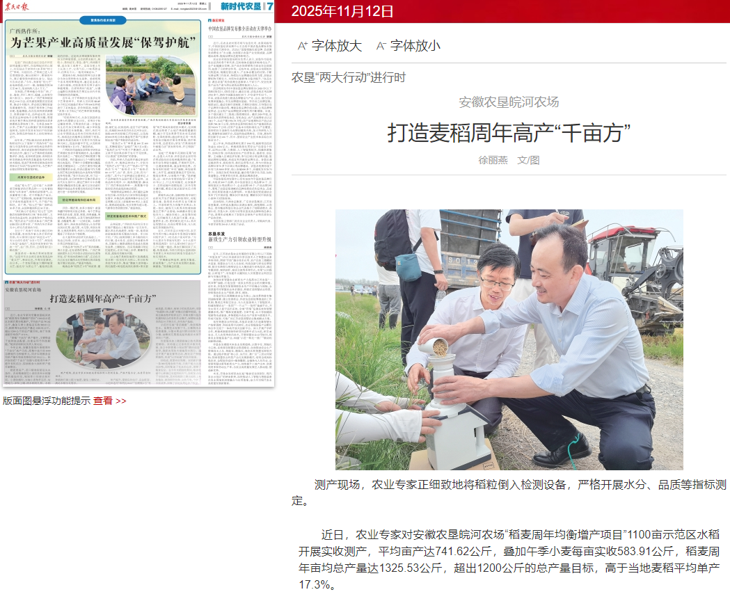 2025年11月12日出版的《农民日报》第7版《新时代农垦》专刊“农垦‘两大行动’进行时”栏目,刊登了徐丽燕采写的新闻稿《安徽农垦皖河农场打造麦稻周年高产“千亩方”》,现予转发,共同分享——