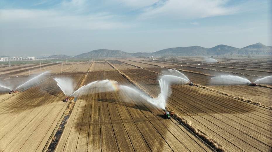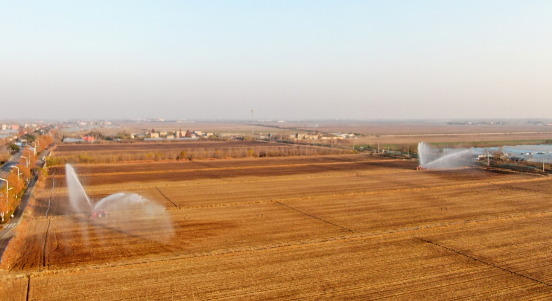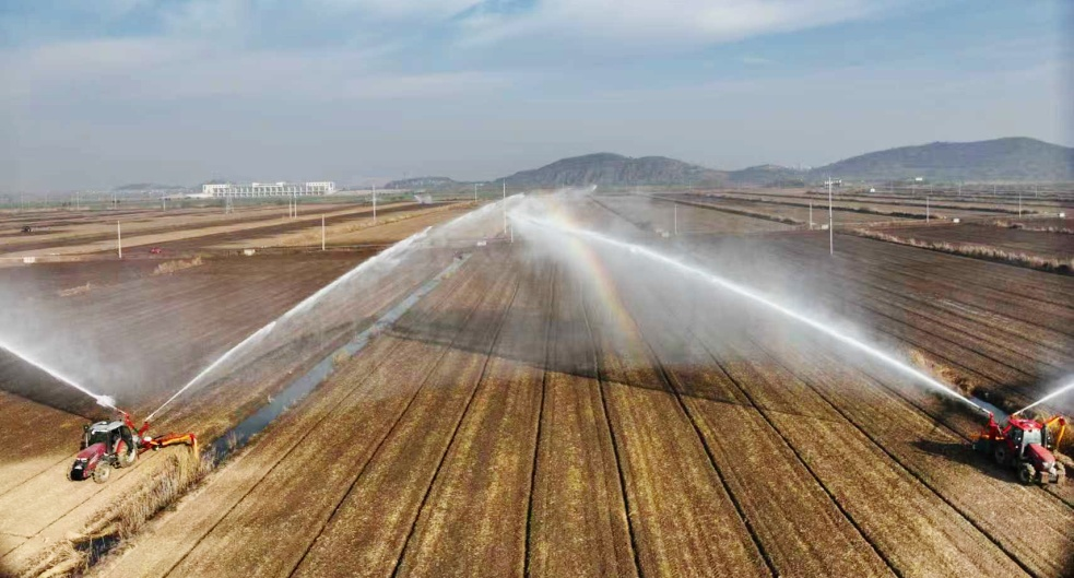 华阳河农场针对部分晚稻茬小麦土壤墒情不足的情况,迅速组织喷灌抗旱,实施精准补水,确保稻茬麦齐苗越冬。(李龙)