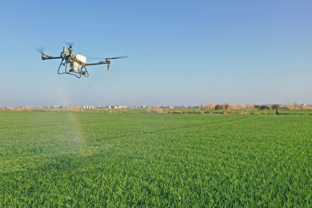 2月21日,大年初五,水家湖农场麦田里,植保机来回穿梭、有序作业,精准喷施高效低毒药剂,紧盯出苗较晚小麦生长薄弱环节,重点防控红蜘蛛等易蔓延病虫害,为全年小麦丰产筑牢基础。(孙彩维)