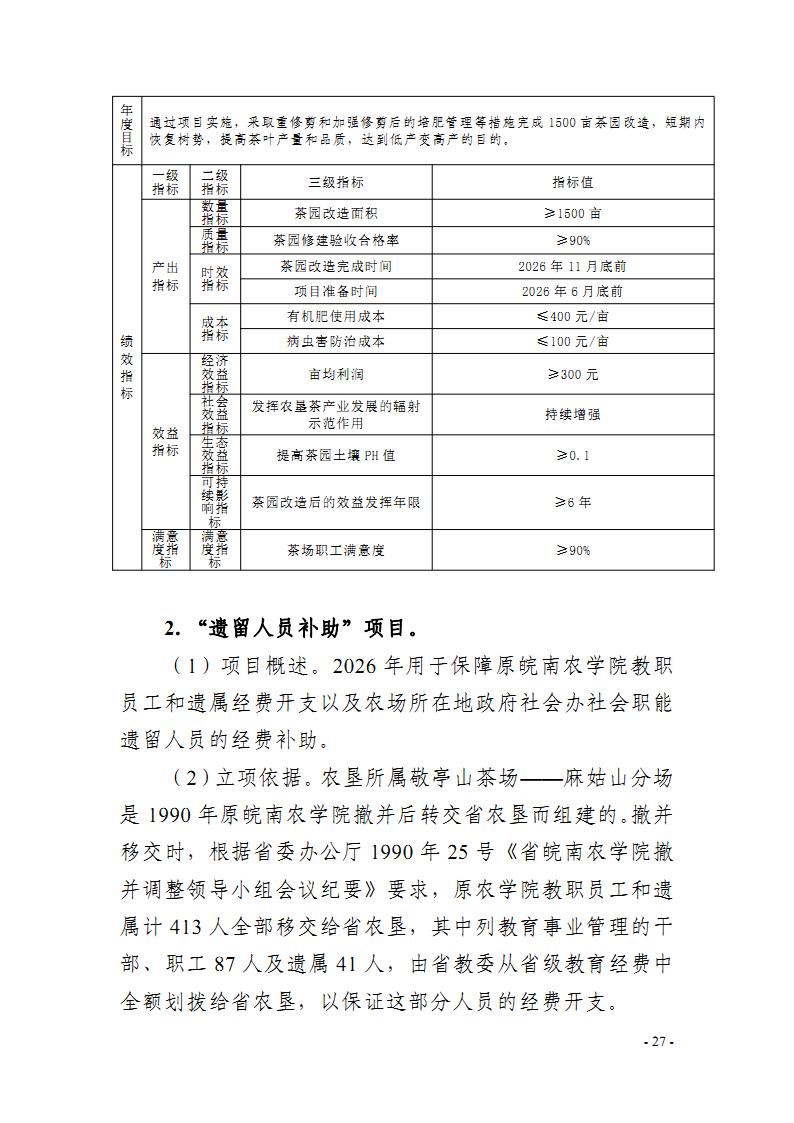 安徽农垦集团:安徽省农垦事业管理局2026年部门预算批复的其他项目绩效目标