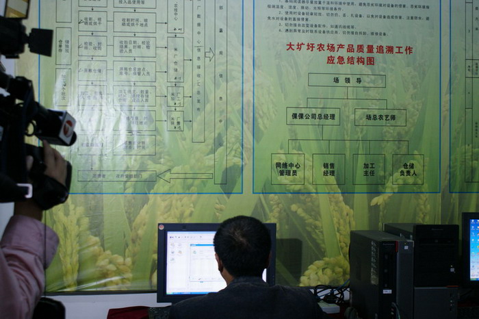 大圹圩农场2008年成为全国首批、安徽省首家实施大米生产质量追溯系统建设项目单位,历经3年建设,目前“生产可记录,信息可查询,流程可跟踪,责任可追究”的追溯系统已全面形成,倮倮大米实现了“从农田到餐桌”全程质量安全体系,3年累计追溯规模达43262亩。眼下正值该场水稻收获、新谷收购、大米加工季节,安徽电视台摄制组深入各农管区实地拍摄了倮倮米业原粮生产、收获储藏、大米加工的质量追溯过程,并向相关人员进行了现场采访。