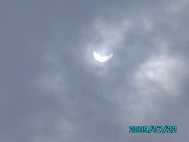 9时39分前后,天空渐渐透亮。团团黑云在天空移动,太阳只露出一线亮光,继而再次出现月牙形状。渐渐恢复如初。