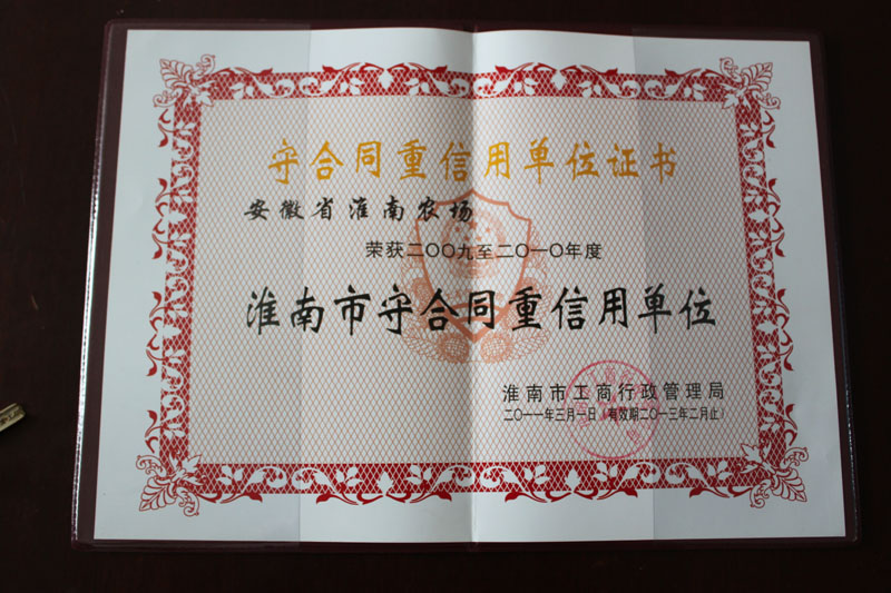 近日,淮南农场荣获淮南市“2009-2010年度守合同重信用单位”称号,这是该场连续第六年获此殊荣。