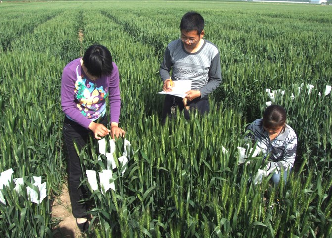 图:农场农业科技人员在为小麦杂交授粉并做品种记录