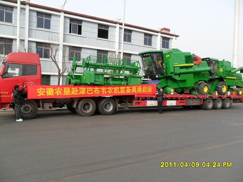 安徽农垦第三批赴津巴布韦农机装备抵达天津即将离港启运,本批物资为10台世界先进品牌约翰迪尔收割机,John Deer 1048型号和 John Deer 1076型号各5台。预计于6月份可抵达津巴布韦皖津农场,按时投入到小麦等作物的收割。(徐曙)