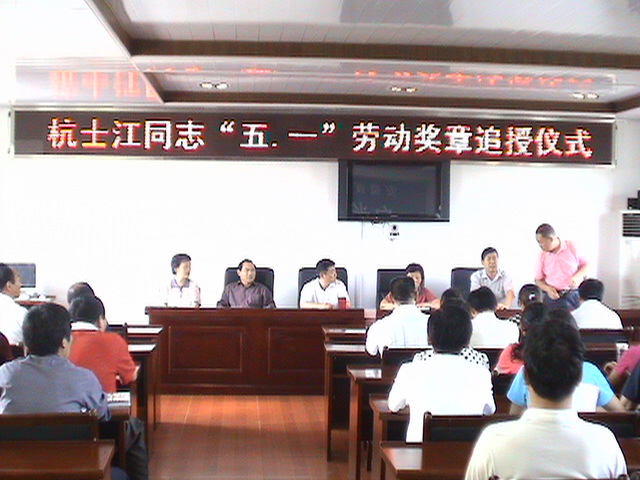追授大会由冯贵良部长主持。首先由周德亮副主席宣读了安徽省总工会《关于追授杭士江同志“安徽省五一劳动奖章”的决定》。白米山农场党委副书记、工会主席张华平介绍了杭士江同志见义勇为的过程和生平事迹。吴茂香主任发表讲话,她说,省总工会决定追授杭士江同志“安徽省五一劳动奖章”,一是慰藉英雄的英灵,褒扬杭士江同志见义勇为、舍己救人的英雄壮举和崇高精神;二是激励生活中的世人,号召广大干部职工学习英雄勤勤恳恳、任劳任怨、热情友善、朴实大方的优秀品质;学习他爱场、爱家、关爱他人、心系社会的高尚品德;三是努力推动社会形成崇尚英雄、学习英雄、关爱英雄、争当英雄的浓厚氛围,进一步弘扬社会正气,引领社会风尚。