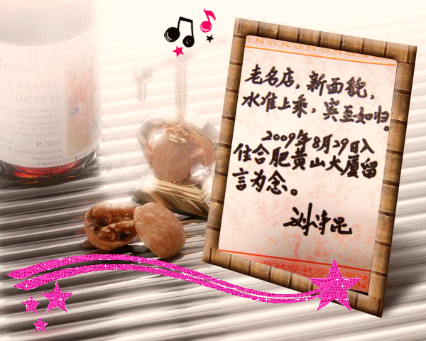 8月29日,我国著名钢琴家刘诗昆下榻安徽农垦黄山大厦城市商务酒店,并题词留念。