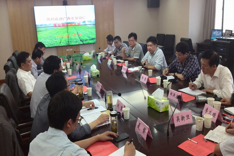 10月10日,广西农垦局土地资源管理部门及西江房地产开发建设有限公司一行8人到安徽农垦考察交流土地管理、房地产开发、垦地合作等工作,安徽农垦集团副总经理程军率土地建设规划部、经济合作开发部、通和房地产集团及宣城公司、皖垦茶业集团负责人参加了座谈交流。(万亮)