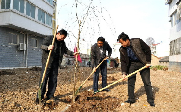 3月11日,在安徽农垦潘村湖农场蟠龙花园小区,场长柏华胜等场领导正在和干部职工一道参加社区组织的义务植树活动。