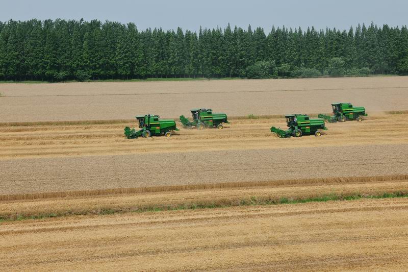 当前“三夏”生产进入高潮,全国小麦机收正由南向北快速推进。为确保粮食颗粒归仓,日前,安徽农垦抢收保种,全系统已投入大型联合收割机械、拖拉机等农机具5000台套。图为寿西湖农场农机会战现场。(经济日报2016年6月13日11版,鲍广云摄)